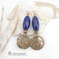 These handcrafted earrings feature beautiful tube-shaped lapis lazuli gemstones accented with hammered gold brass dangles and tiny brass beads. The stones are a beautiful rich shade of blue with a sprinkling of natural sparkly pyrite inclusions. These earrings have a modern, earthy chic elegance and can be worn with a variety of outfits - dressed up or down. They'll make a great gift for couples celebrating their 9th or 21st wedding anniversary. Brass is the traditional choice for a 21st anniversary and lapis is the gemstone for a 9th anniversary gift.