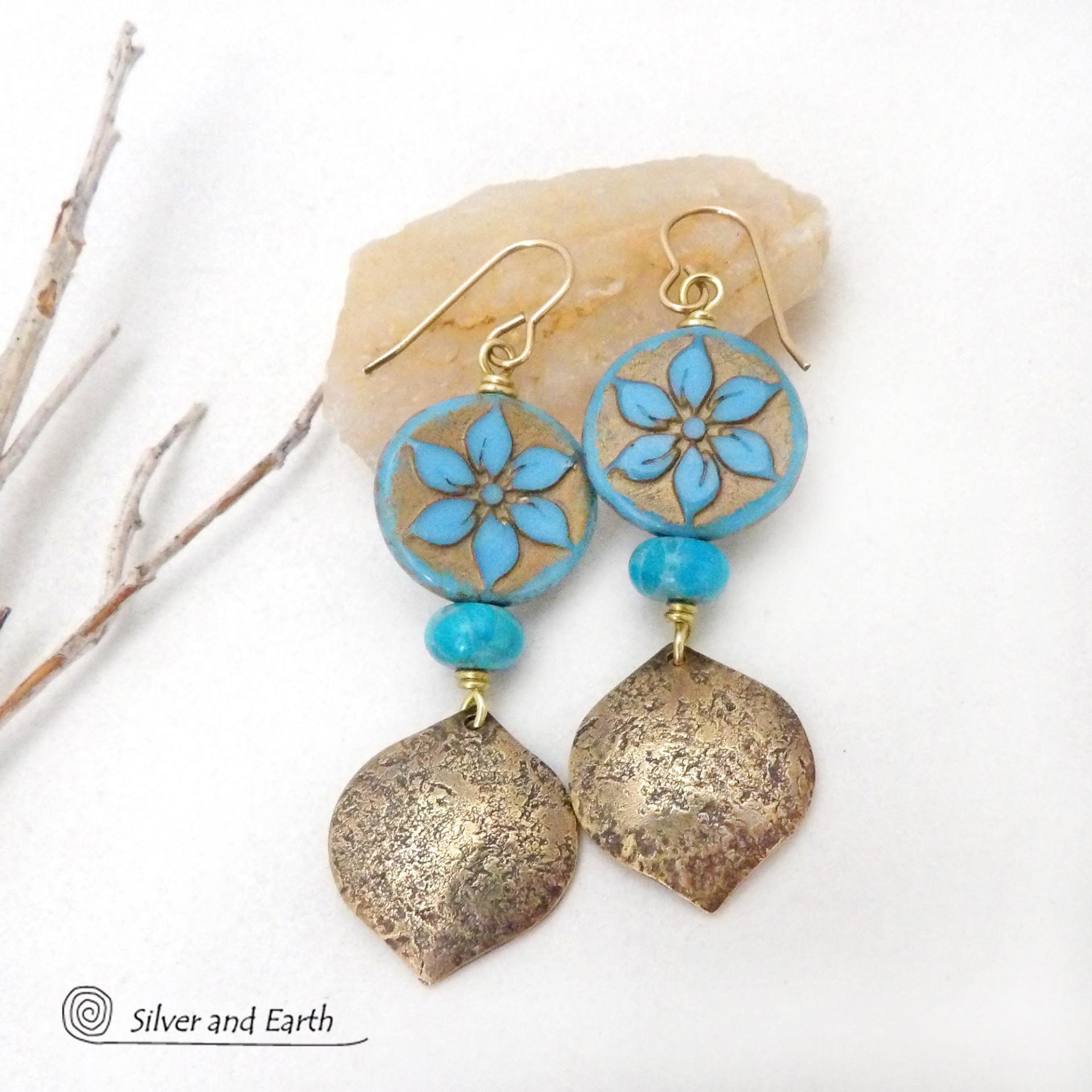 These handcrafted earrings feature gold brass dangles with a lightly hammered raw silk texture accented with glass flower beads and turquoise stone beads. The flower beads are a pretty shade of blue with golden highlights. They have an intricate carved and raised pattern on both sides of the beads. These earrings have a modern elegant, earthy chic style and will make a great gift for anyone that loves flowers and nature. They'll make a great addition to your spring / summer wardrobe - or any time of year.