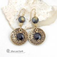 Gold Brass Earrings with Faceted Black Onyx and Golden Black Tiger's Eye Gemstones