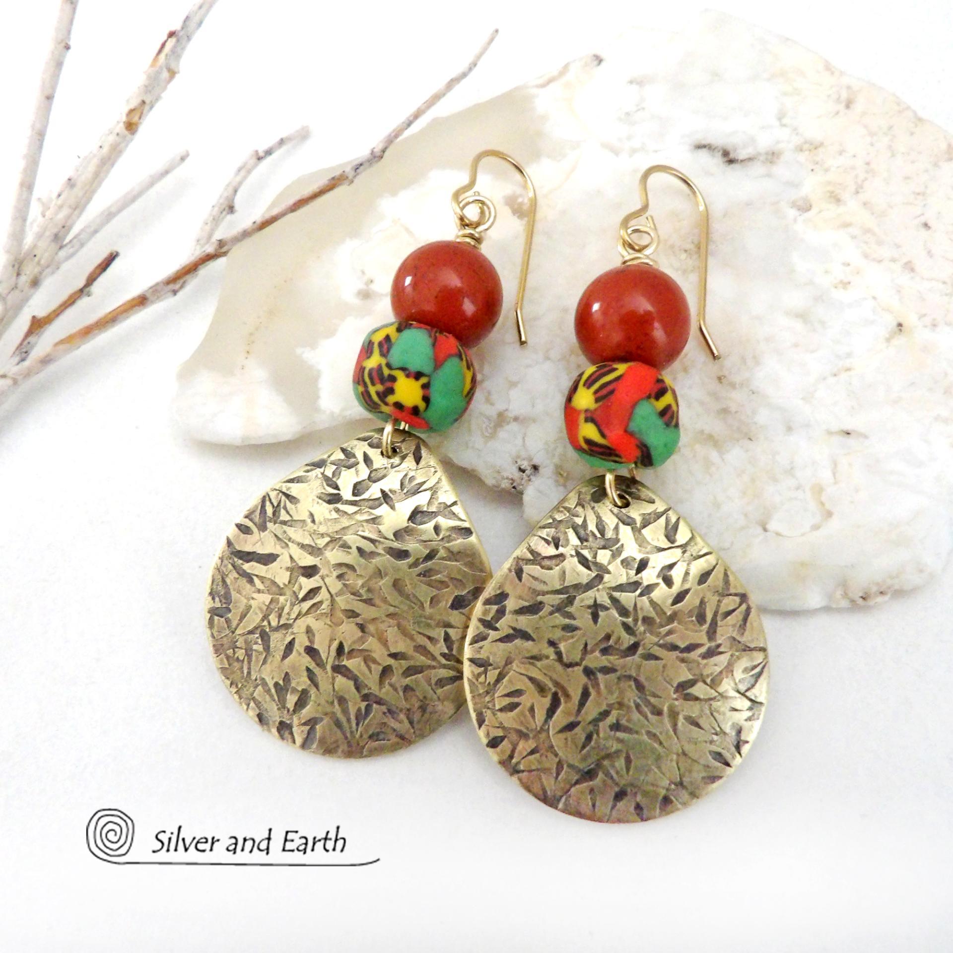 These handcrafted earrings feature gold brass dangles with a hand textured design accented with red jasper gemstones and colorful African glass beads with multi-colored hues of green, red, yellow and black. The glass beads are handcrafted by artisans in Ghana from recycled glass through a traditional process passed down thru many generations. They have a bold exotic, tribal vibe with a vibrant pop of color that makes a unique statement.