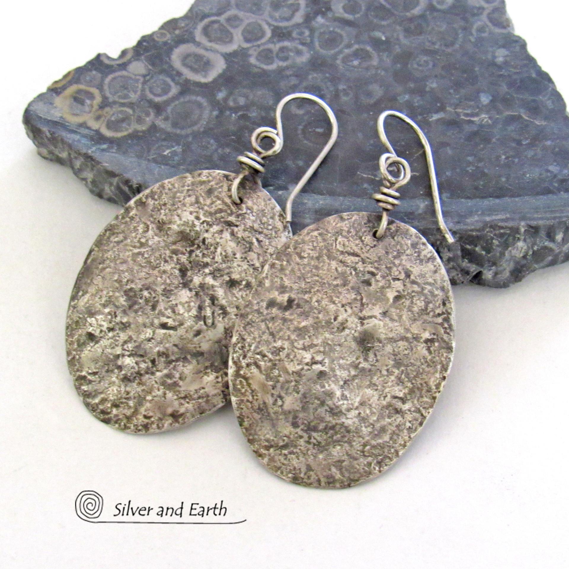 MEASUREMENTS: Total length: 2-1/4” from top of sterling silver ear wires and 1-1/8" at widest point. I created the shapes out of solid sterling silver sheet; hammered the texture into the metal; then oxidized, buffed and polished it to enhance the detail. They are signed on the back with my initials and sterling stamp.