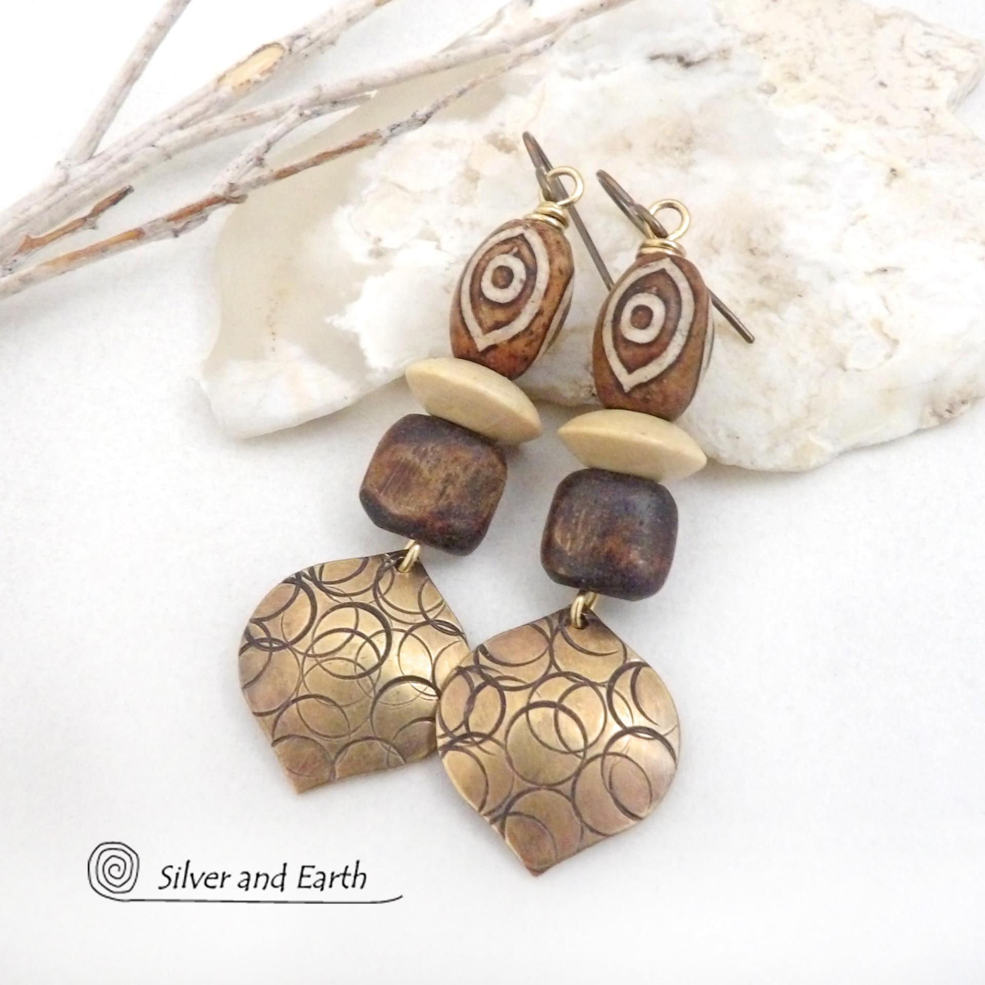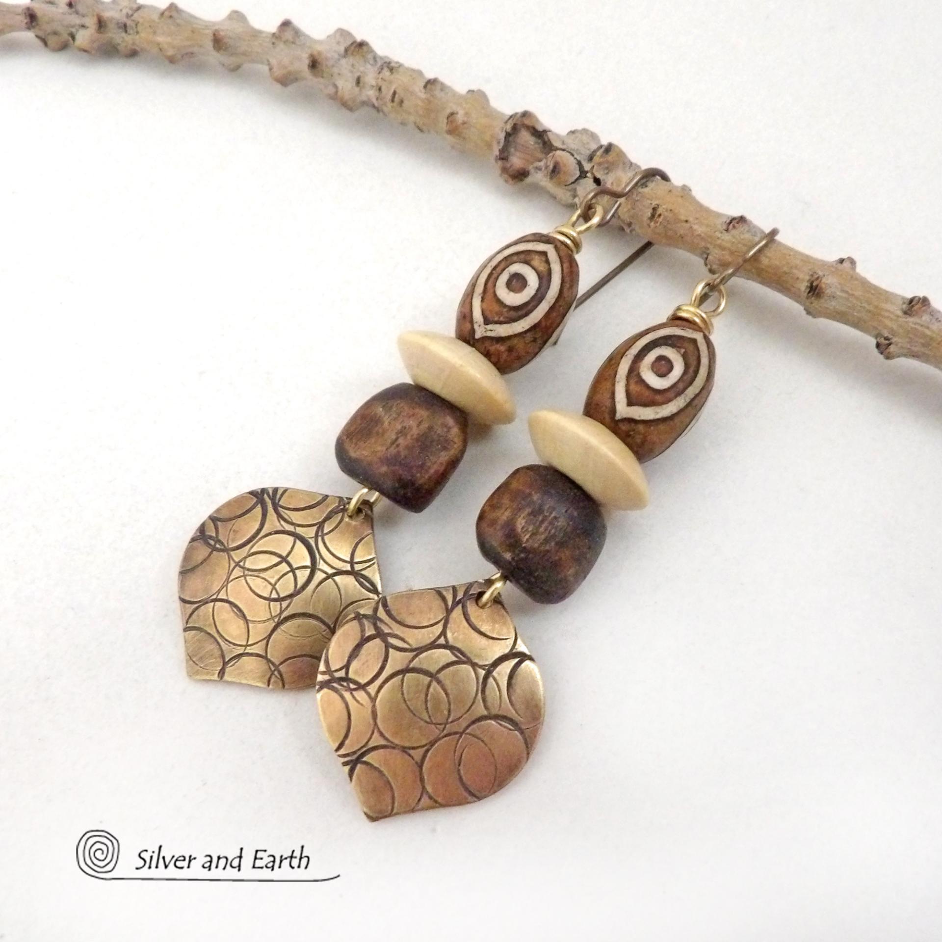 These handcrafted earrings feature gold brass dangles with a hand stamped texture accented with brown Tibetan etched agate stones, brown wood beads and tan wood saucer beads. Bold and unique, they have an ethnic tribal style with boho flair that makes a striking statement.