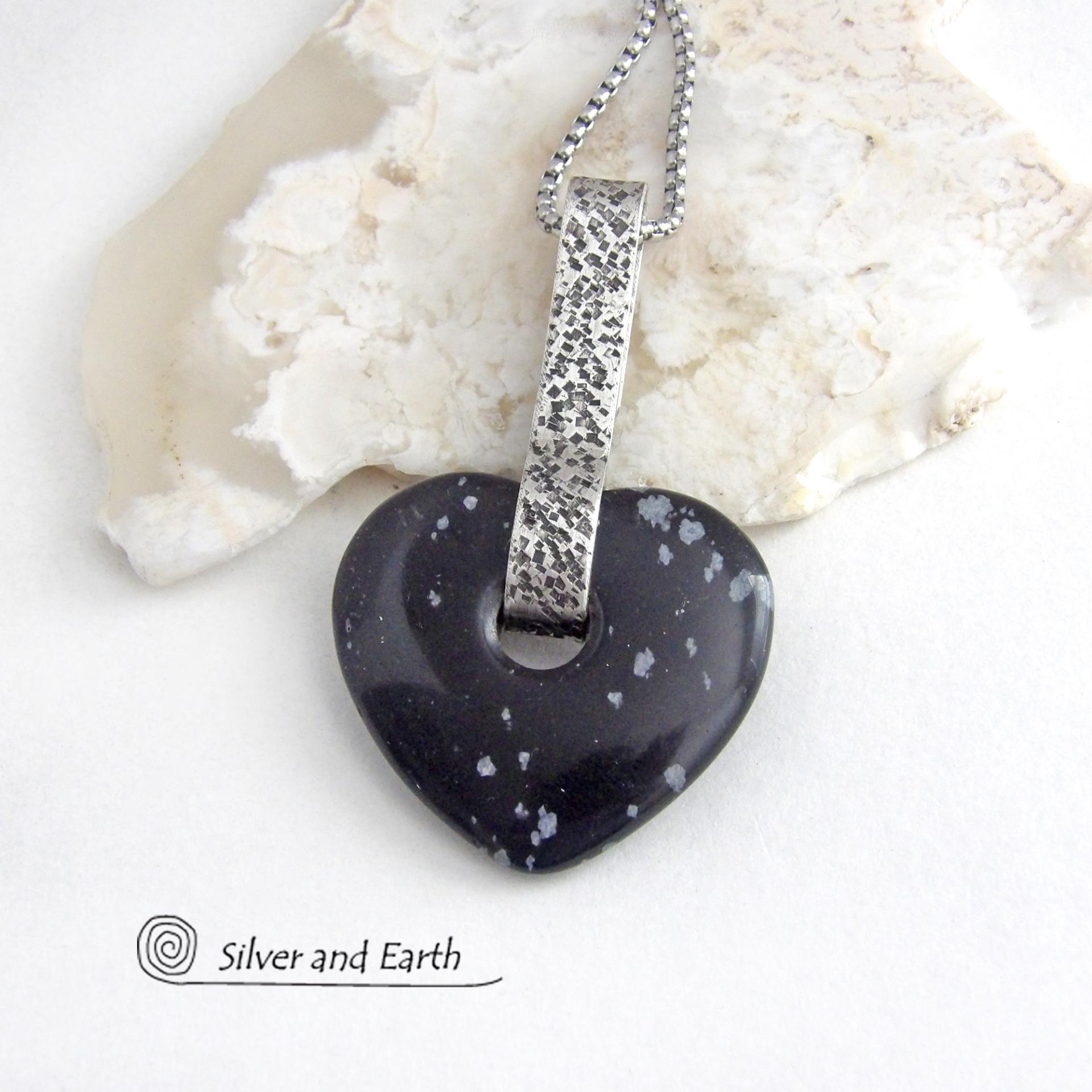 Heart Shaped Snowflake Obsidian Gemstone Sterling Silver Necklace - Anniversary Jewelry Gifts for Women