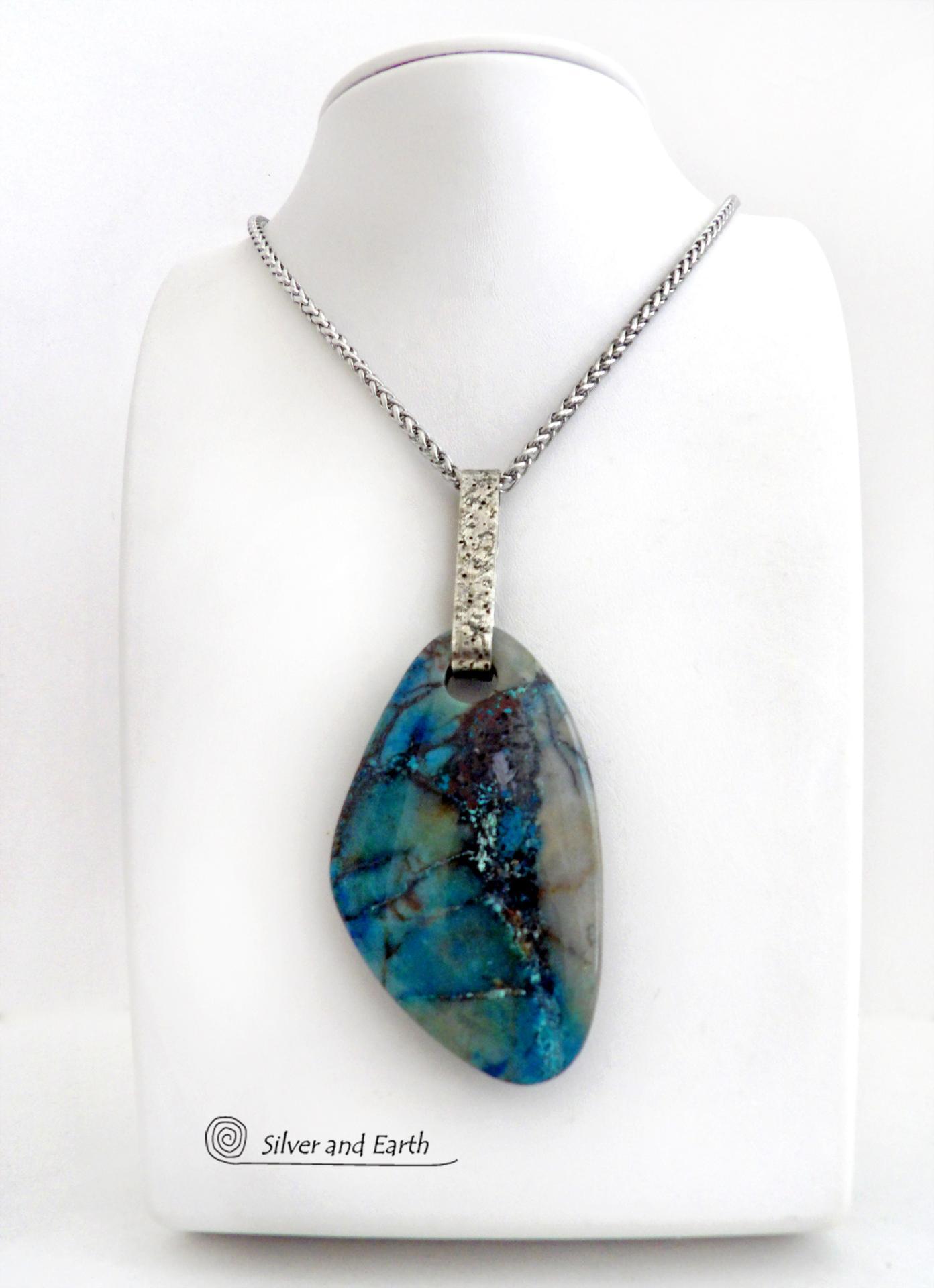 Large Blue Chrysocolla Quartz Gemstone Sterling Silver Necklace - One of a Kind Unique Natural Stone Jewelry