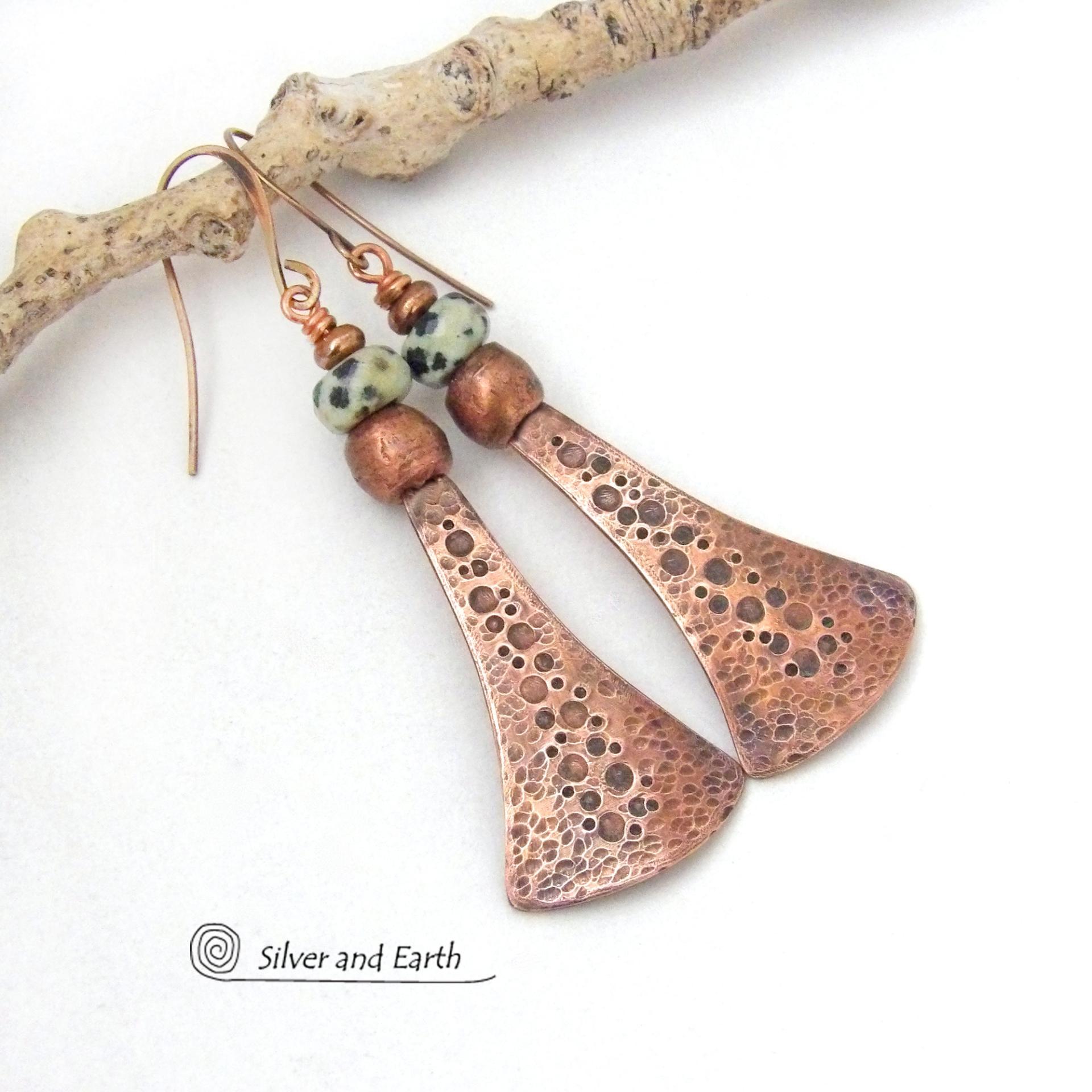 Long Copper Dangle Earrings with Dalmatian Jasper Stones - Artisan Handmade Earthy Chic Boho Style Jewelry
