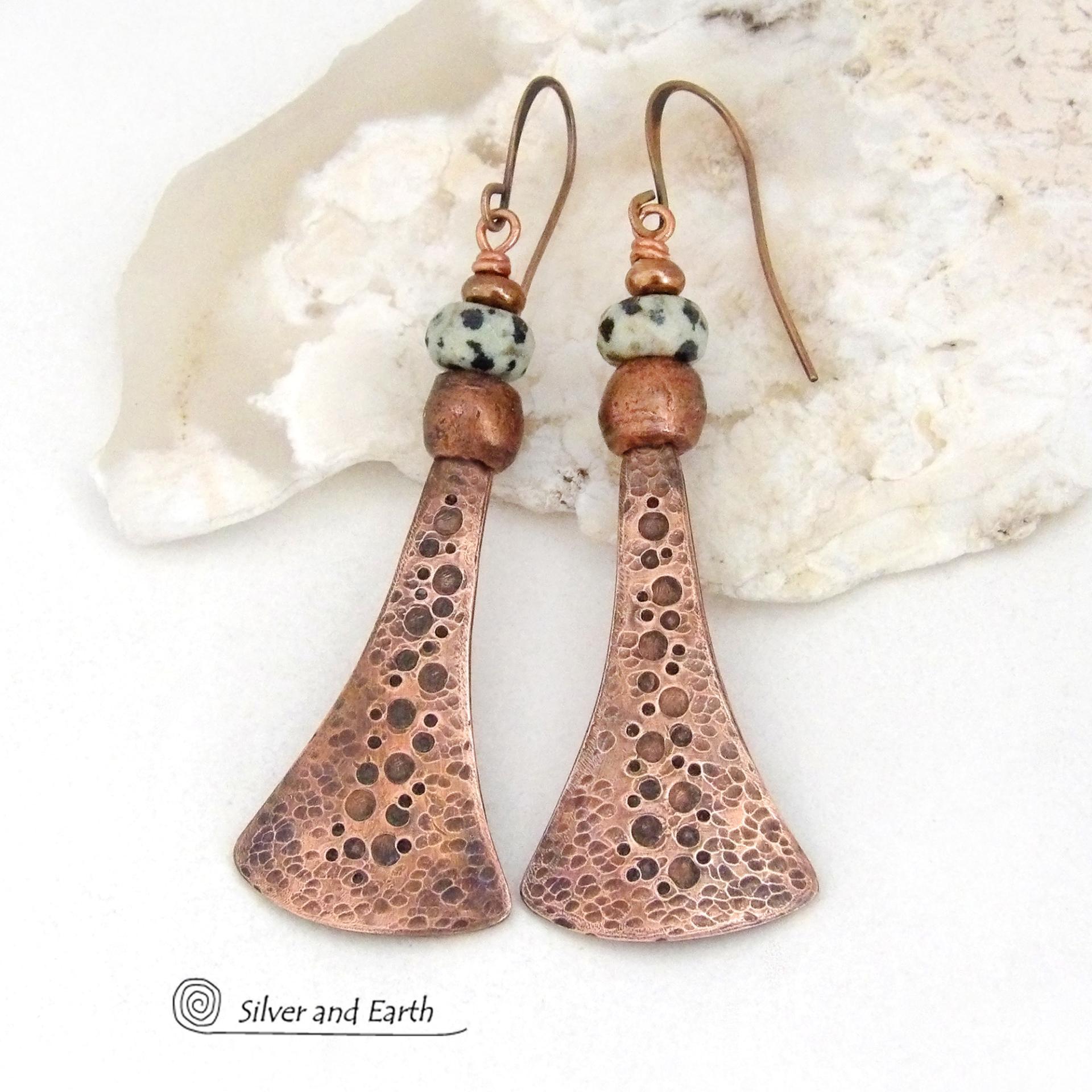 These handcrafted earrings feature uniquely textured long copper dangles accented with spotted Dalmatian jasper stones and copper beads. Bold and unique, they have an earthy chic style with a bohemian vibe. Makes a great gift for couples celebrating their seventh wedding anniversary, as copper is the traditional choice for this occasion.