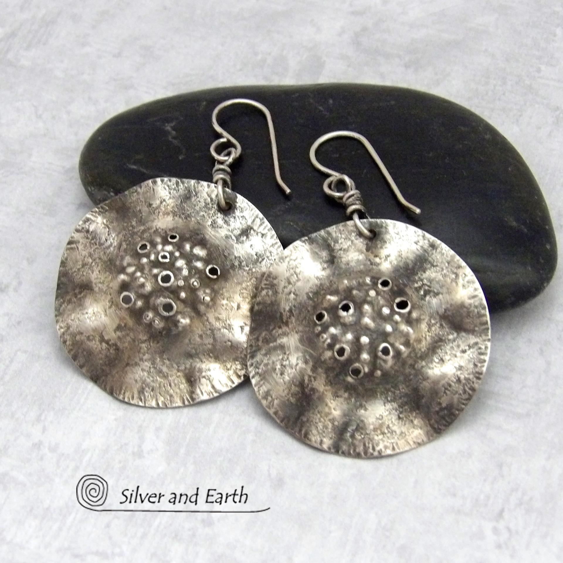 These handcrafted solid sterling silver earrings have a modern, organic earthy style with an edgy vibe. Perfect for everyday wear - they go with everything. They feature large round sterling silver dangles with a bumpy hammered texture and a rustic oxidized satin finish.