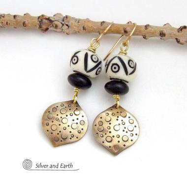 MEASUREMENTS: Total length of approx. 2-1/4" from top of brass ear wires and 3/4" at widest point. Created out of solid gold brass; the shapes were hand stamped for texture; oxidized and polished for a golden glow; then sealed with jeweler's wax to resist tarnishing. They are signed on the back with my initials.