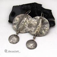Modern and versatile - these handcrafted sterling silver dangle earrings have an earthy, organic design with an edgy, modern style. Perfect for everyday wear - they go with everything. They feature solid sterling silver with a rustic, hammered texture and an oxidized finish.