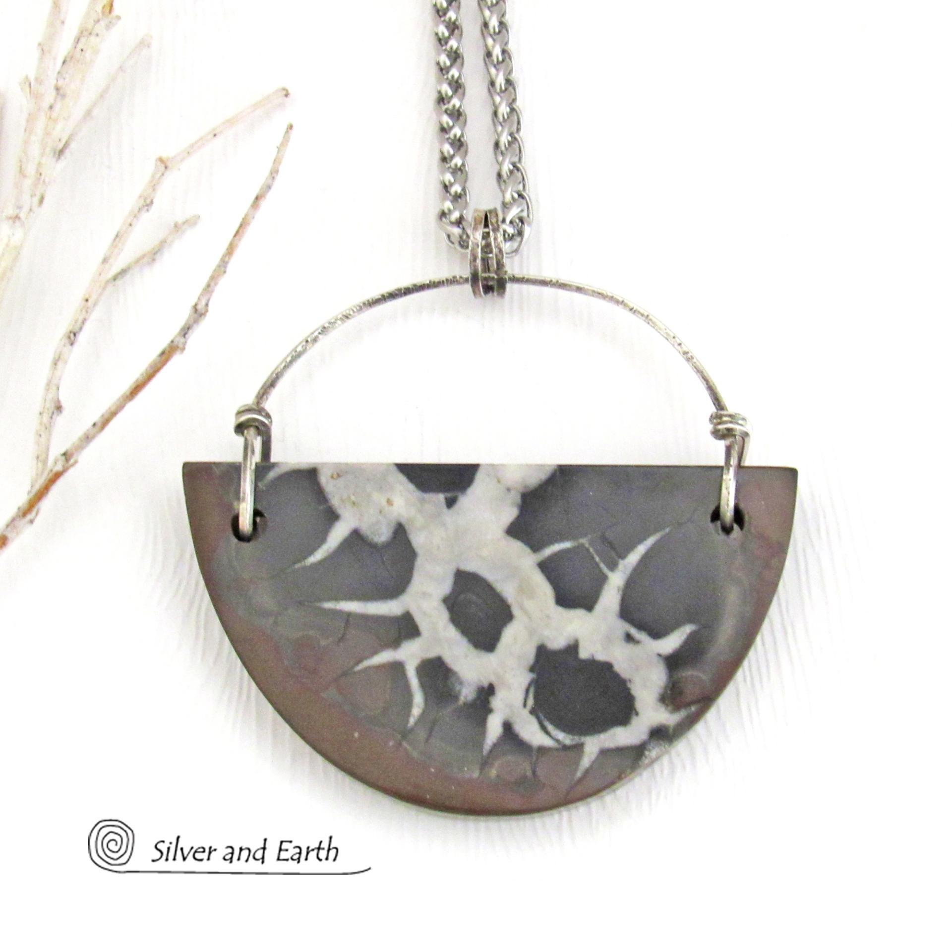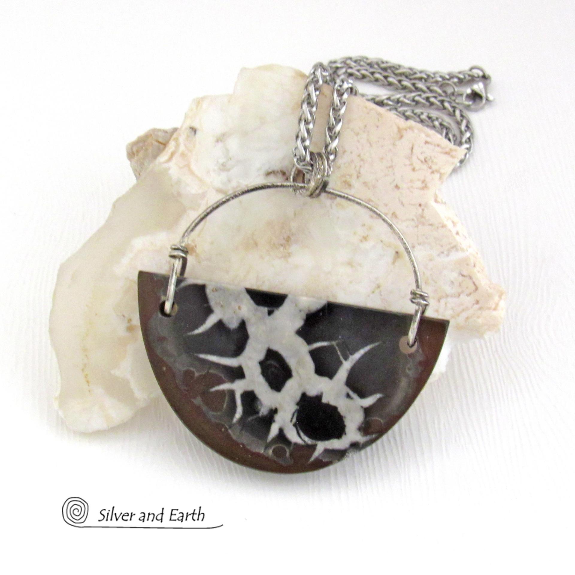 This necklace features a natural Septarian Nodule fossil stone suspended from a sterling silver wire bail. The stone has a dark chocolate brown and black background with a creamy white matrix pattern. It hangs from a 20" stainless steel necklace with lobster claw closure. Unique and one-of-a-kind, it has an earthy, natural style that makes a bold statement. The style is unisex, so it can be worn by either a man or woman.