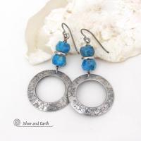 These silver pewter hoop earrings have a lightly hammered texture and are accented with faceted blue apatite gemstones and stainless steel spacer beads. Lightweight and comfortable to wear, they have a modern chic style that coordinates beautifully with all wardrobe types.