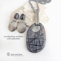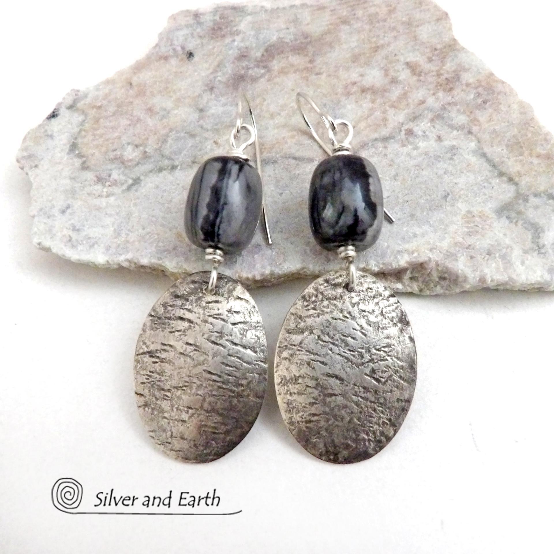 These handcrafted earrings feature sterling silver oval dangles accented with Picasso marble gemstones. This semiprecious stone is found only in southwest Utah. It's named after the famous artist because the natural matrix of geometric lines resembles an abstract painting. The stones in this pair have distinctive swirly lines in black and grey. They have a modern, earthy style and are lightweight and comfortable to wear.