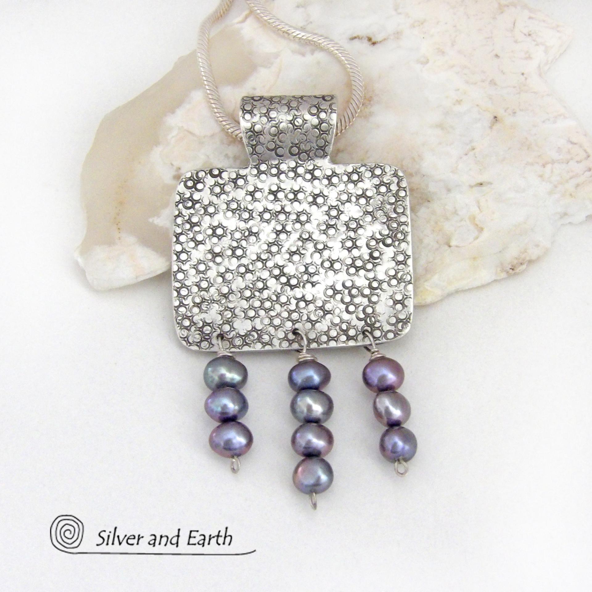 This handcrafted sterling silver necklace has a hand stamped texture and is accented with silvery blue freshwater pearl dangles. It has a modern, earthy - yet elegant dressy design that will complement many wardrobe styles. I hand sawed the pendant out of solid sterling silver sheet; created the texture; then oxidized it to enhance the details. The pearls were stacked on sterling silver wire and added to dangle from the bottom.