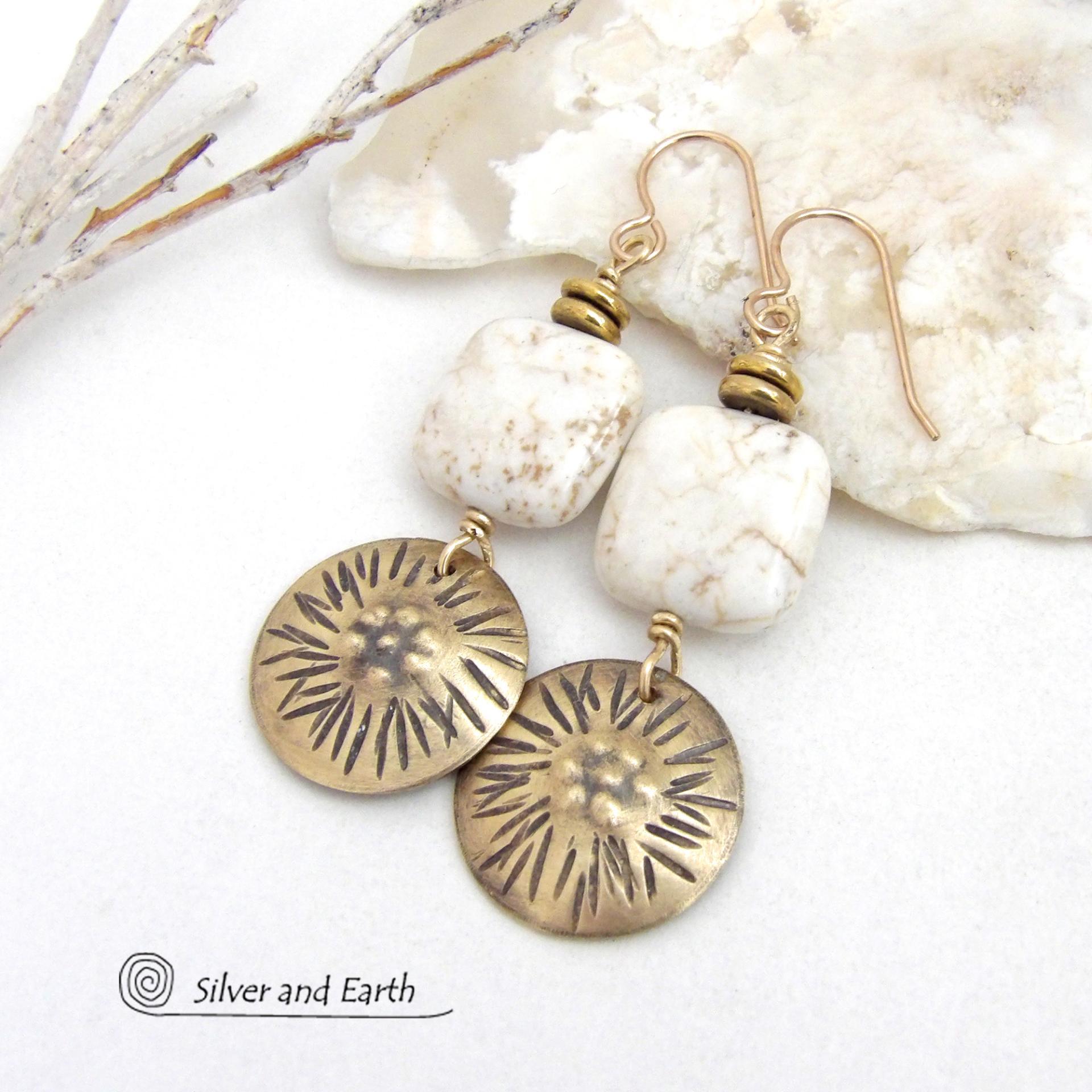 These gold brass dangle earrings have a unique hand textured design and are accented with creamy white magnesite stones. The stones have a natural matrix of golden-brown speckled inclusions and are topped off with tiny brass beads. I created the dangles out of solid gold brass sheet; and then created the texture which reminds me of the golden rays of the sun. The metal was oxidized to enhance the detail; then sealed with jeweler's wax to resist tarnishing.