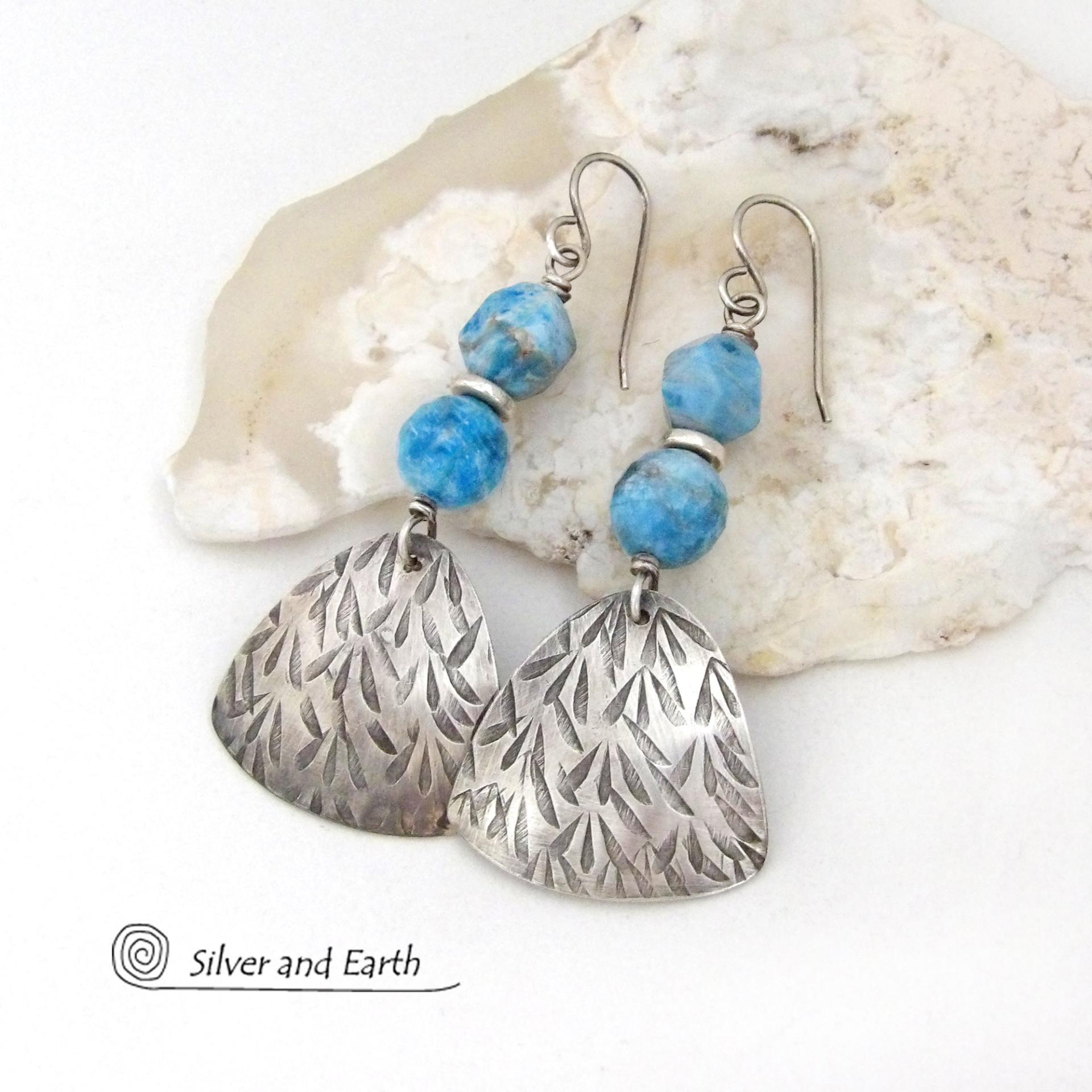 These handcrafted sterling silver dangle earrings have a hand stamped texture and are accented with natural apatite gemstones. The stones have a beautiful blue hue and the ones on top have a faceted nugget finish. They have an elegant, modern style that looks great with all wardrobe styles - dressed up or down. Tiny pewter beads were added as an accent.