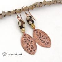 African Batik Bone & Copper Dangle Earrings with Rustic Hammered & Stamped Texture - Bold Unique Ethnic Boho Tribal Jewelry