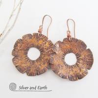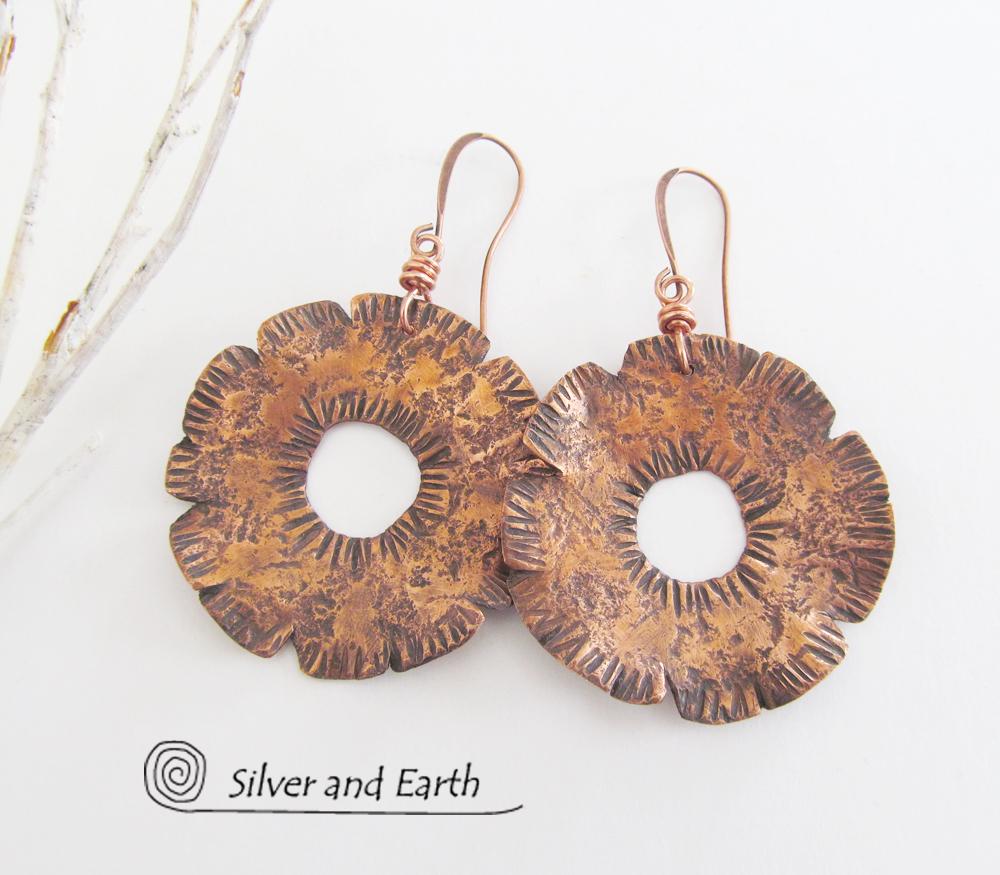 Big, bold and earthy - these hand forged copper earrings have a rich, hammered texture and an open pierced design. They have a modern, edgy vibe that makes a unique statement. I created the shapes out of solid copper sheet; hammered and pierced the metal; then hand filed all edges until meticulously smooth. The copper was oxidized and polished for a warm, rustic glow; then sealed with jeweler's wax to resist tarnishing.