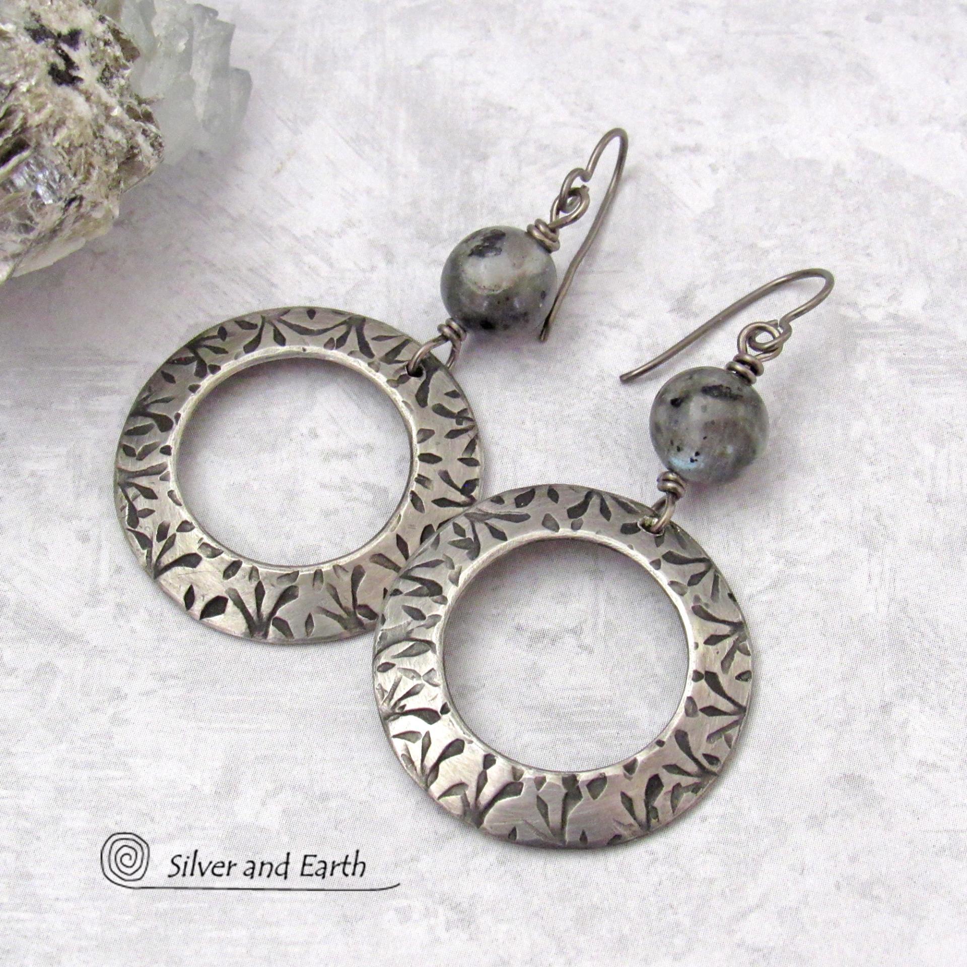 Big Round Silver Pewter Hoop Earrings with Larvikite Gemstones - Black Labradorite Norwegian Moonstone Jewelry