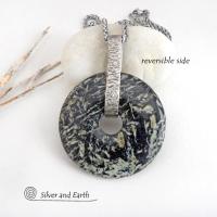 This one-of-a-kind pendant necklace features a stunning black fireworks jasper stone accented with a hand forged sterling silver bail. The stone has a natural dramatic pattern in hues of black with streaks of soft minty green and tan. The design is modern and bold - yet classic and always in fashion. It can be worn by either a man or a women. It's reversible and can be worn on either side. (See all photos for alternate sides).