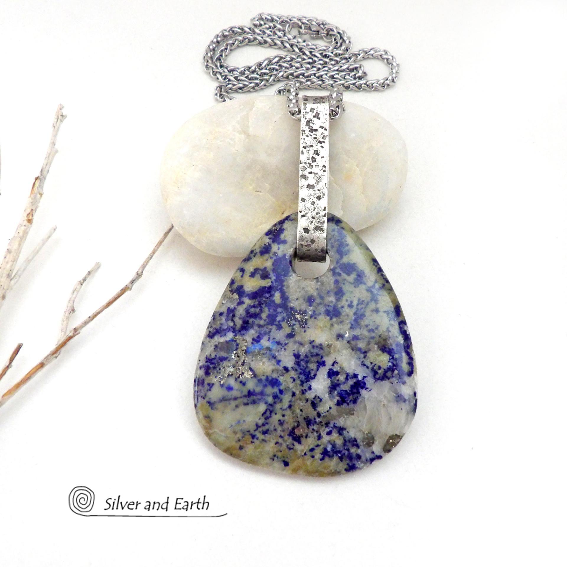 This one-of-a-kind necklace features a stunning natural gemstone comprised of natural lapis lazuli inclusions embedded in a calcite base. Lapis lazuli is formed with three minerals in varying amounts: lazurite, calcite, and pyrite. This stone has a unique matrix pattern with a blend of lapis with calcite which has a soft yellowish hue and a sprinkling of shimmery pyrite inclusions. Each side has it's own unique beauty, so I designed it to be reversible. (See all photos for alternate sides). It's accented with a handcrafted sterling silver bail with a hammered organic texture. Bold and striking, it will make a great gift for a natural stone lover - or a nice addition to your own jewelry wardrobe.
