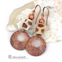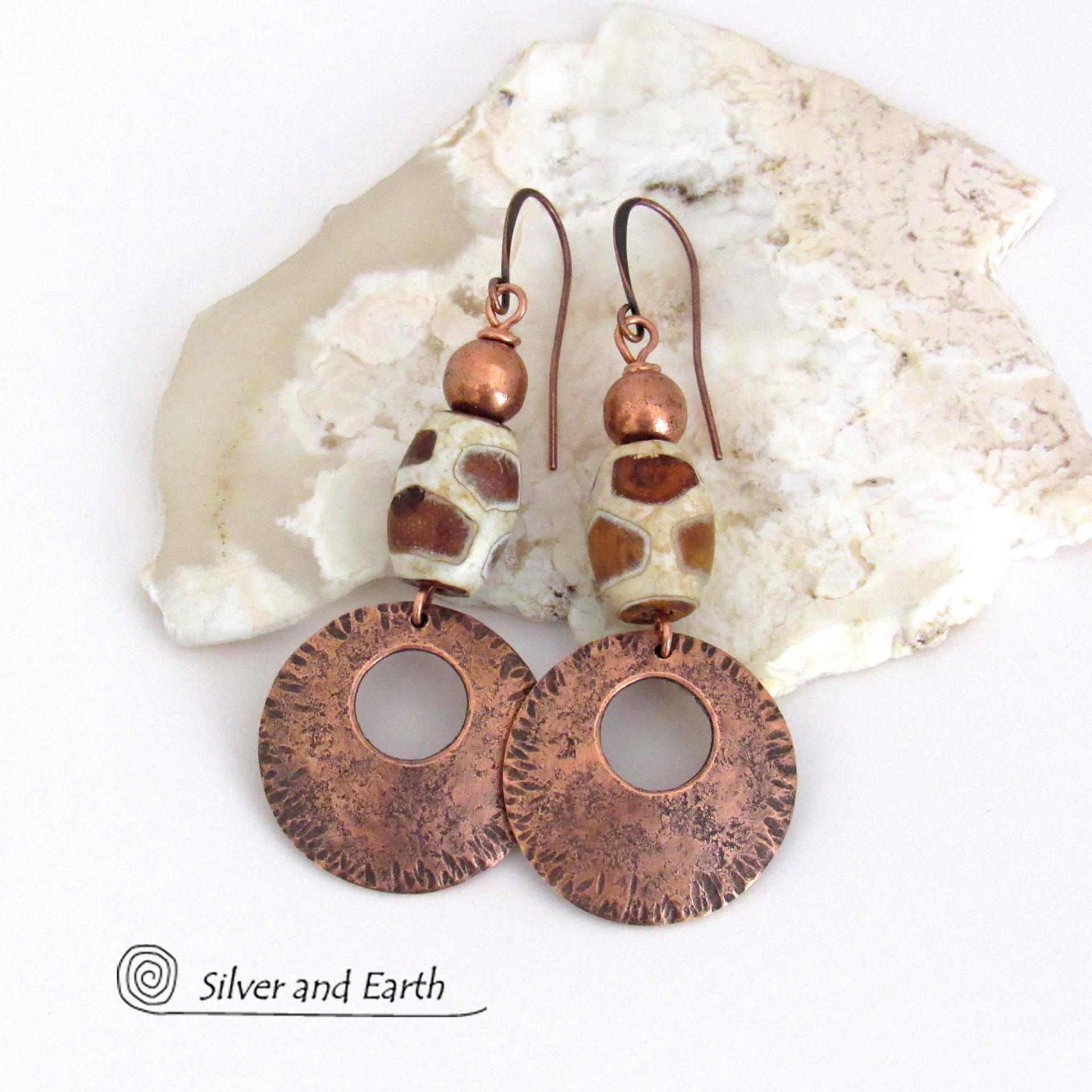 These handcrafted copper earrings have a bold, ethnic African style and flair. They feature round copper dangles with a rustic hammered texture accented with African etched giraffe print agate stones topped off with solid copper beads. Unique and striking, they'll make a bold statement.