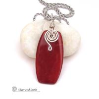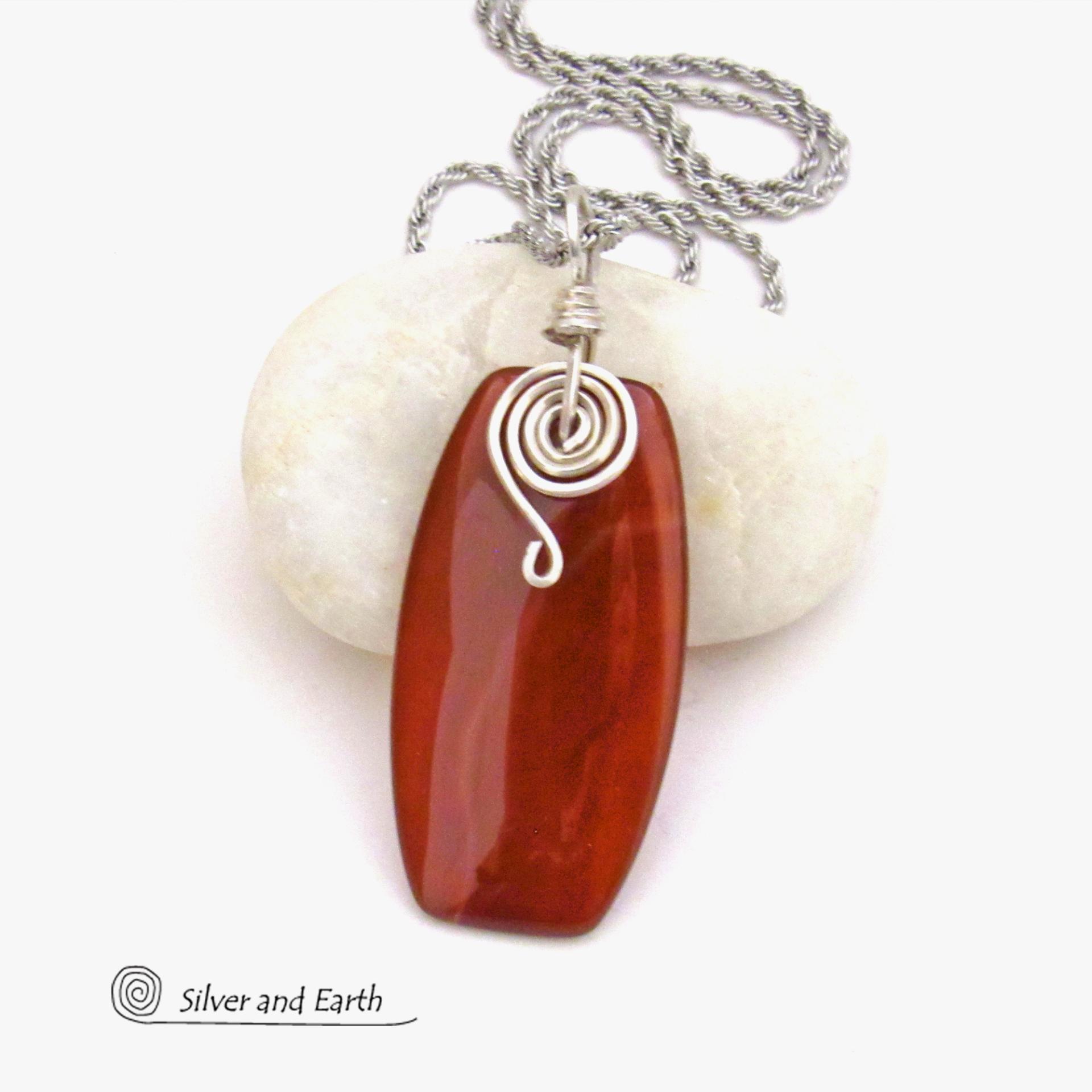 This handcrafted carnelian gemstone necklace has a modern chic flair. It features a natural carnelian gemstone with a dark burnt orange hue accented with a hand forged sterling silver spiral accent and sterling silver wire bail.