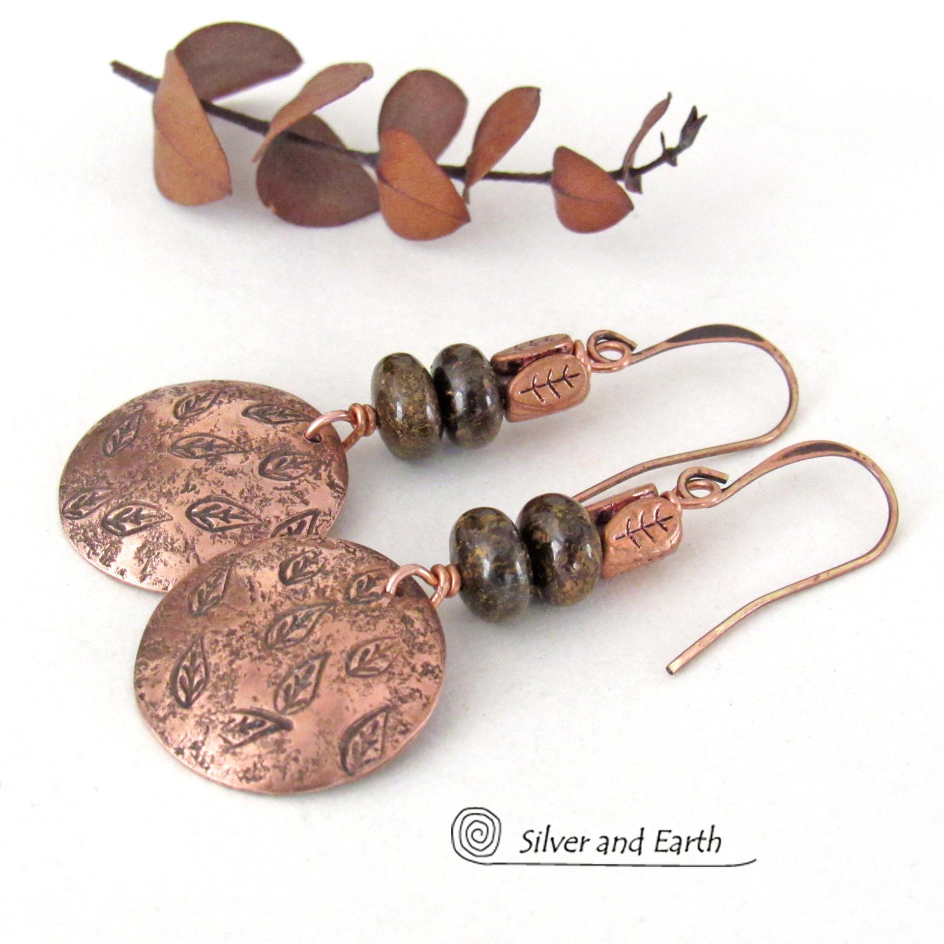 These earrings feature handcrafted copper dangles with a hand-stamped leaf texture accented with natural bronzite stones & topped off with tiny copper beads with an etched leaf pattern. They have an earthy, rustic style and will make a great gift for a nature lover.