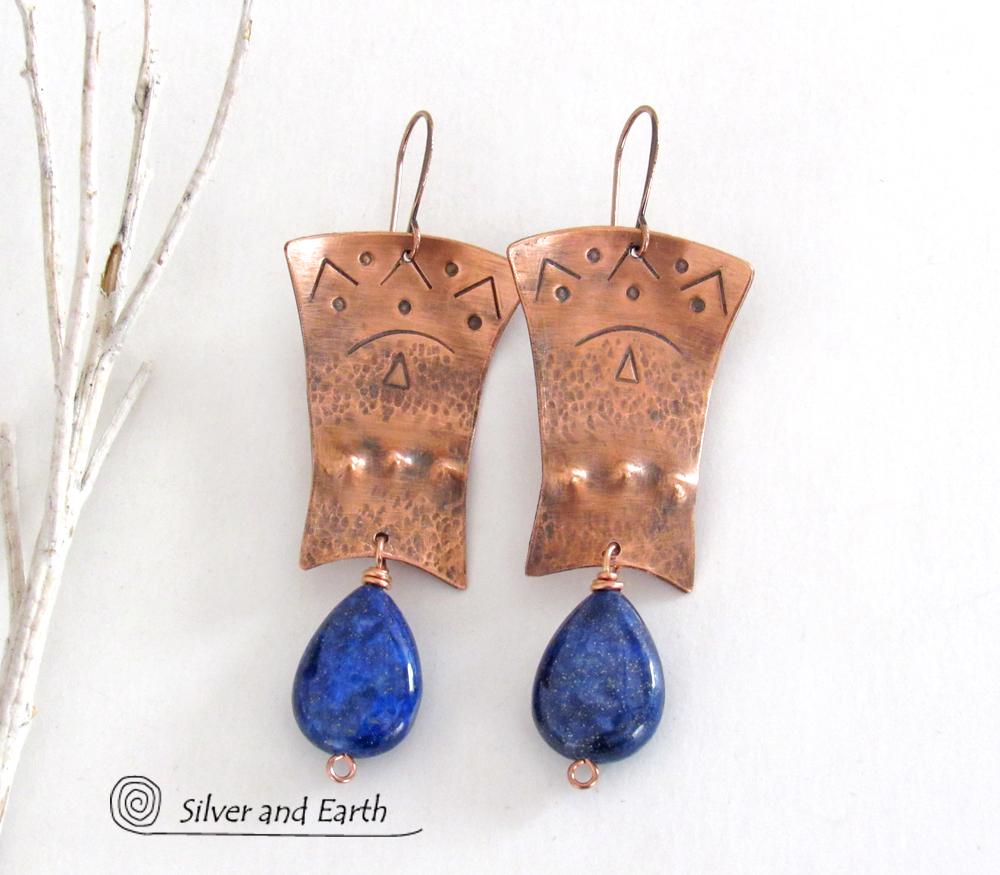 Copper Egyptian Earrings with Lapis Lazuli Gemstones - Bold Exotic Jewelry