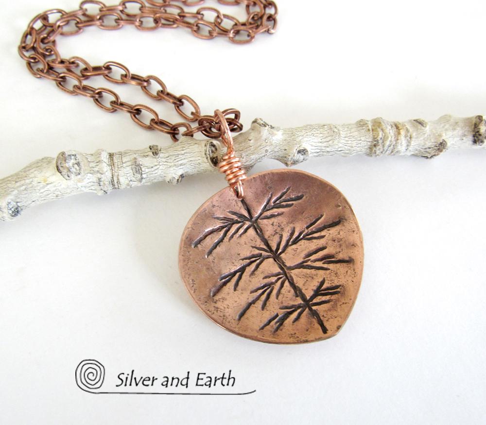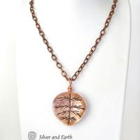 This copper leaf pendant necklace has an earthy charm and will make a great gift for a nature lover. It features a hand stamped texture pattern and comes on an 18" antiqued copper chain with lobster claw closure.