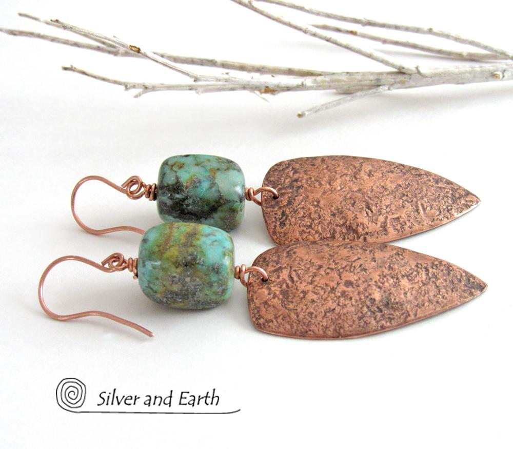These copper tribal shield earrings have a rustic, organic texture and are accented with African turquoise stones. Bold and striking, they have an ethnic tribal vibe and will make a statement!