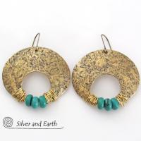 Bold and exotic - these turquoise and gold brass earrings make a statement. They feature handcrafted crescent moons accented with turquoise stones and wire wrapped accents. Moon phase jewelry is super popular right now - so these earrings make a "right-on-trend" fashion statement.