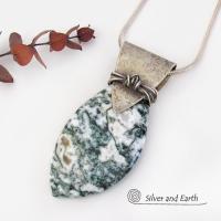 A natural green tree jasper gemstone is accented with a handcrafted sterling silver bail in this unique *one-of-a-kind* necklace. The stone has earthy green mossy inclusions against a white background, along with some subtle tan inclusions. It will make a great gift for anyone that appreciates natural stone jewelry --- or a nice addition to your own jewelry collection.