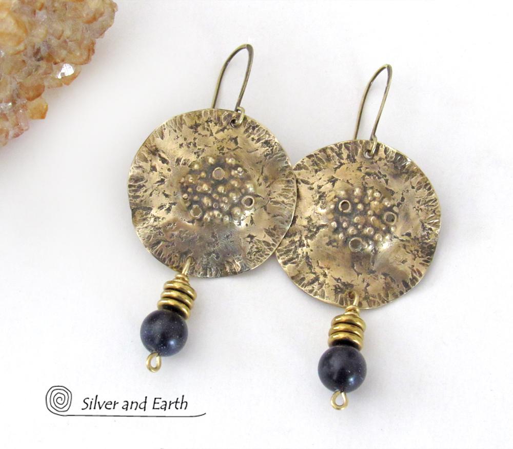 Hammered Gold Brass Earrings with Blue Goldstone Dangles - Earthy Modern Chic Jewelry