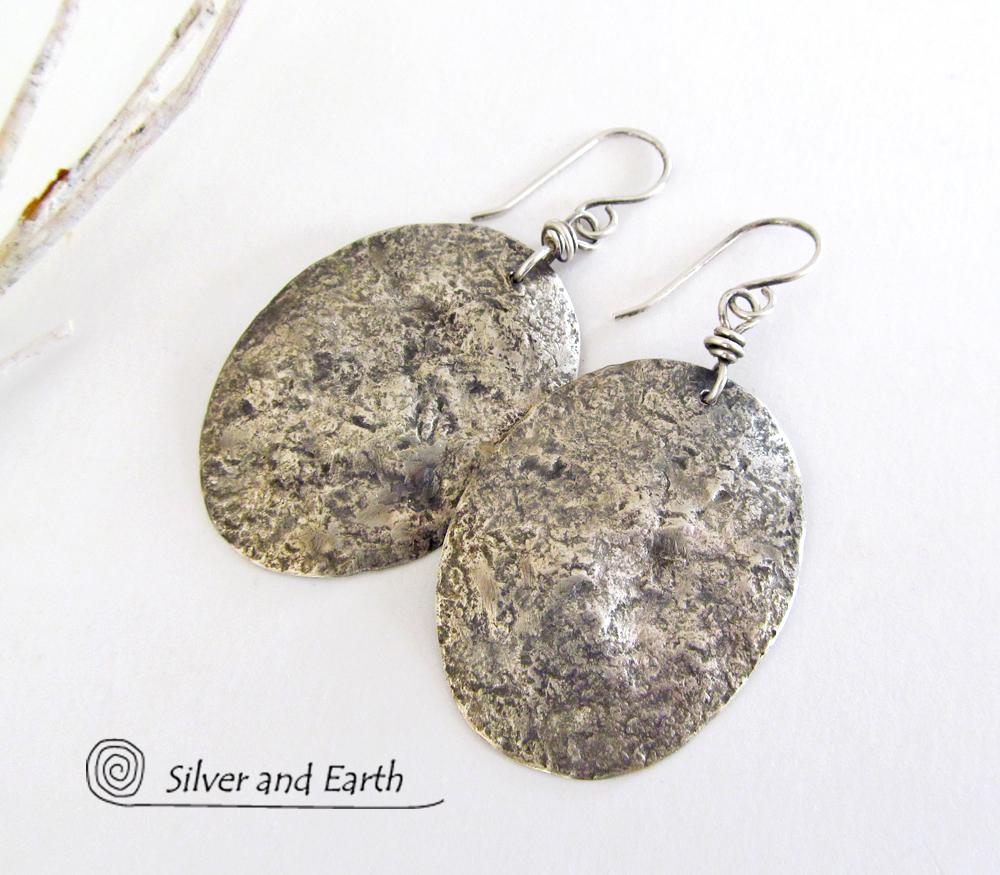 MEASUREMENTS: Total length: 2-1/4” from top of sterling silver ear wires and 1-1/8" at widest point. I created the shapes out of solid sterling silver sheet; hammered the texture into the metal; then oxidized, buffed and polished it to enhance the detail. They are signed on the back with my initials and sterling stamp.
