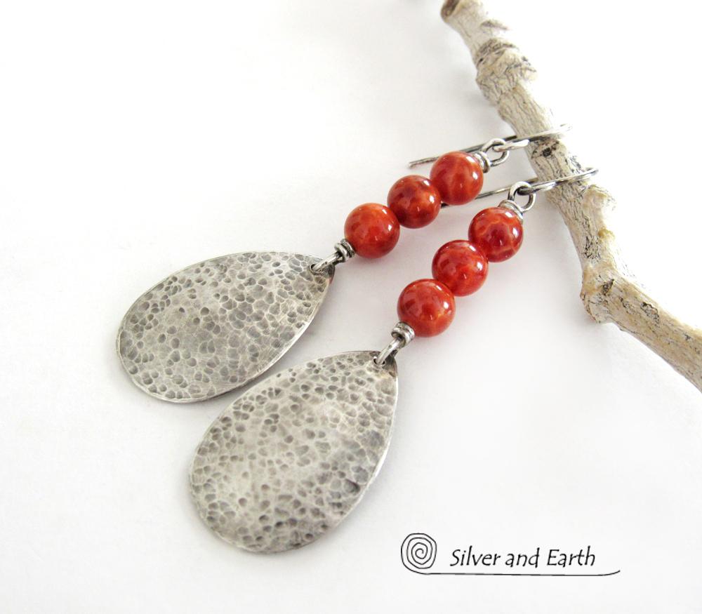 These handcrafted sterling silver earrings have a hammered texture and are accented with fire agate gemstones with an orange hue, along with subtle veins of white. Lightweight and comfortable to wear, they have a classic modern style that looks good with all wardrobe types. ► Coordinating necklace shown in the photos has sold.