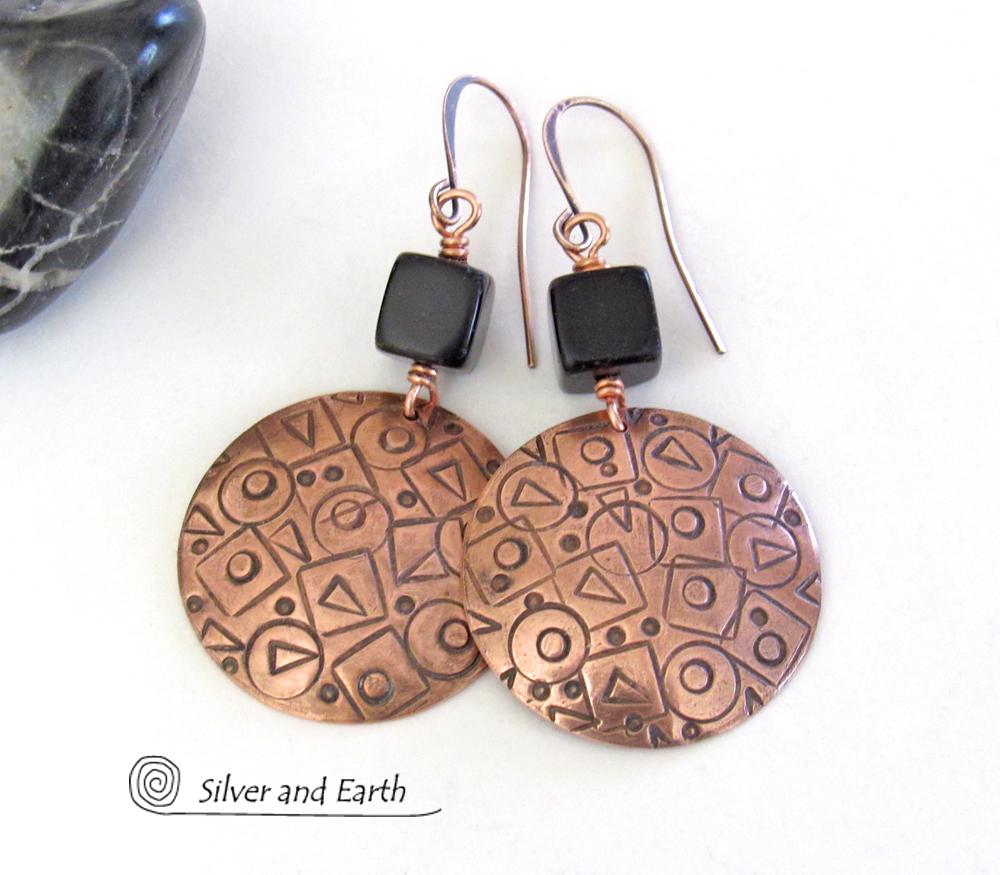 Hand Stamped Copper Earrings with Mod Abstract Texture & Black Jasper Stones - Unique Artsy Handmade Metalwork Jewelry