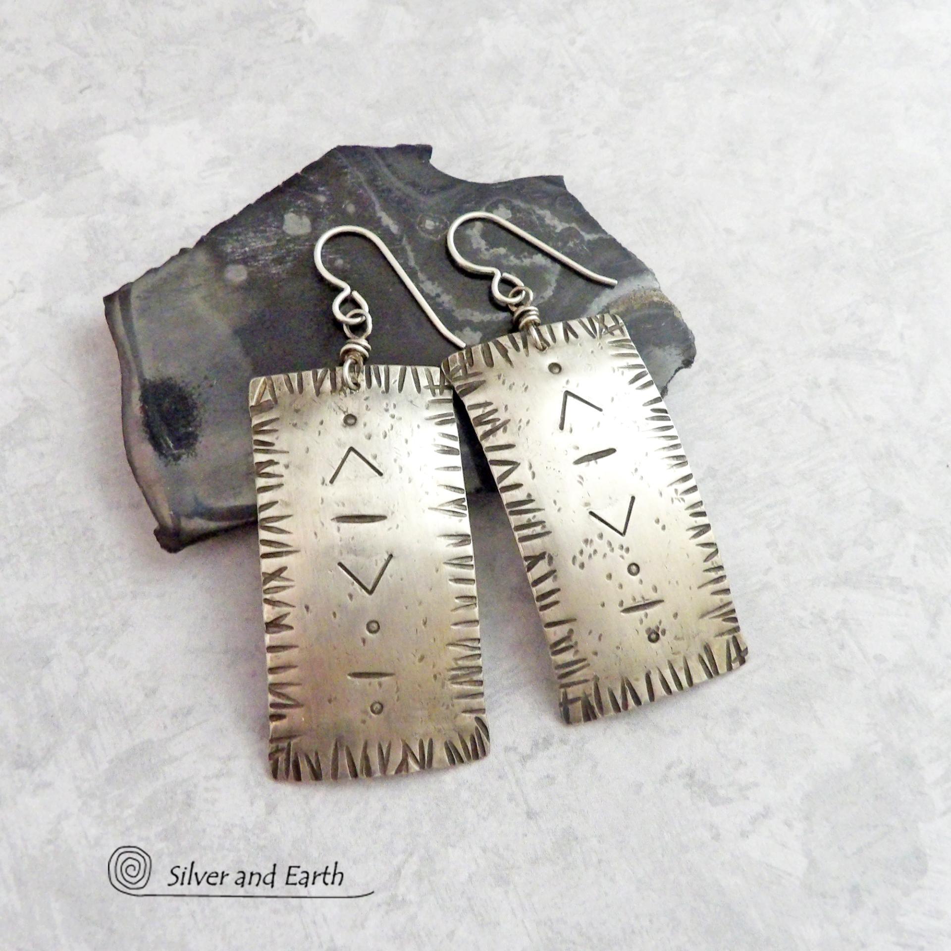 These handcrafted sterling silver earrings have a modern southwestern and tribal flair. They feature sterling silver rectangles hand stamped with a tribal pattern that resembles a southwestern blanket. Unique and versatile, they'll look great with all wardrobe styles.
