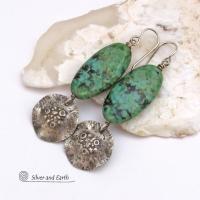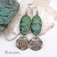 Long African Turquoise Stone Earrings with Rustic Hammered Sterling Silver Dangles