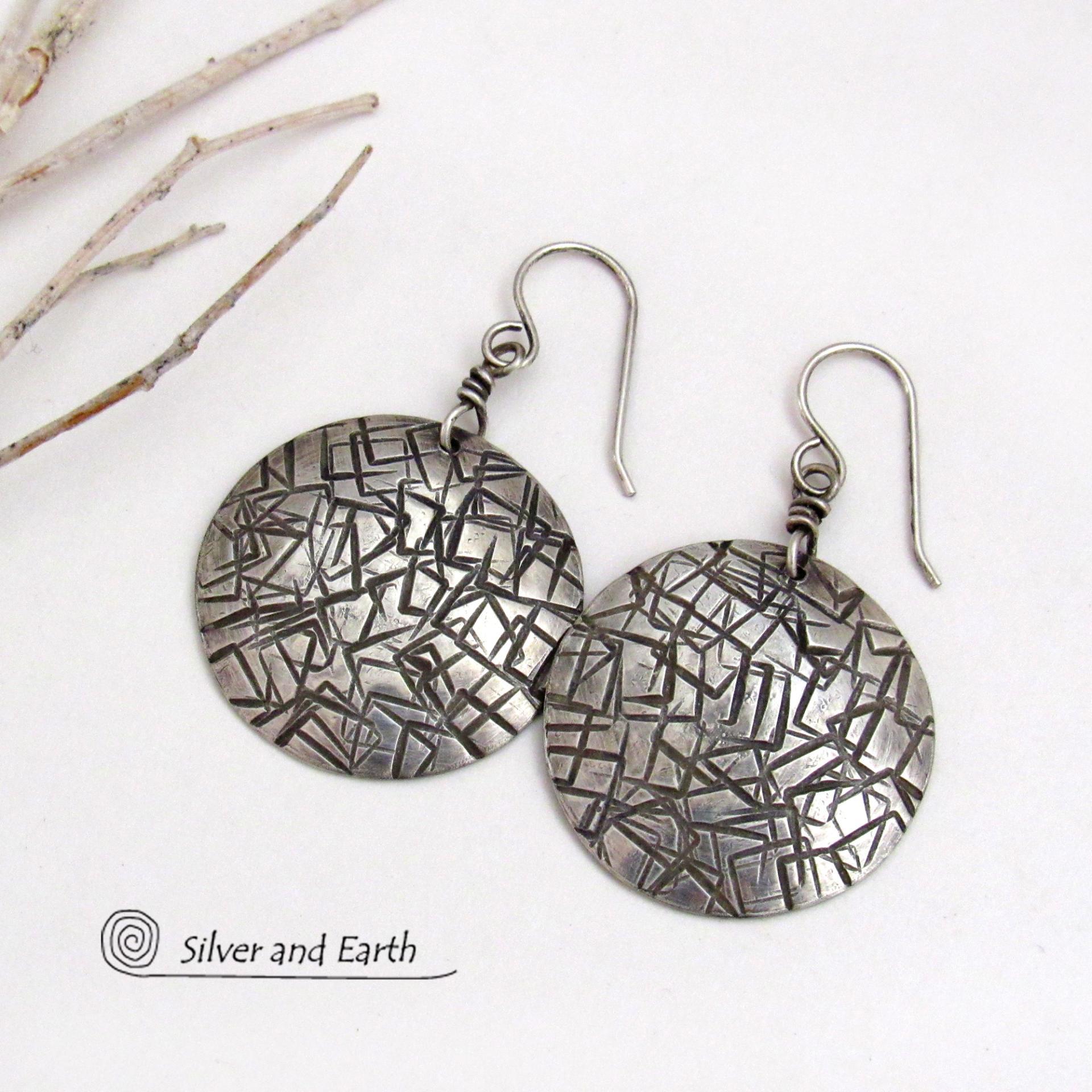 These handcrafted sterling silver earrings have a simplistic, modern style that is perfect for everyday wear because they go with everything. They have an abstract hand stamped texture that was oxidized to highlight the details. Lightweight and comfortable to wear, they'll coordinate beautifully with all wardrobe styles.