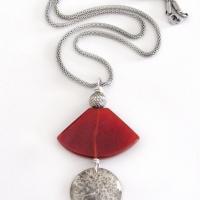 A natural carnelian gemstone is accented with a hammered sterling silver dangle in these necklace. The stone is carved into a unique fan-shaped "slice" and exhibits hues of burnt orange with subtle undertones of brown and a translucent luster. It is topped off with a textured sterling silver bead.