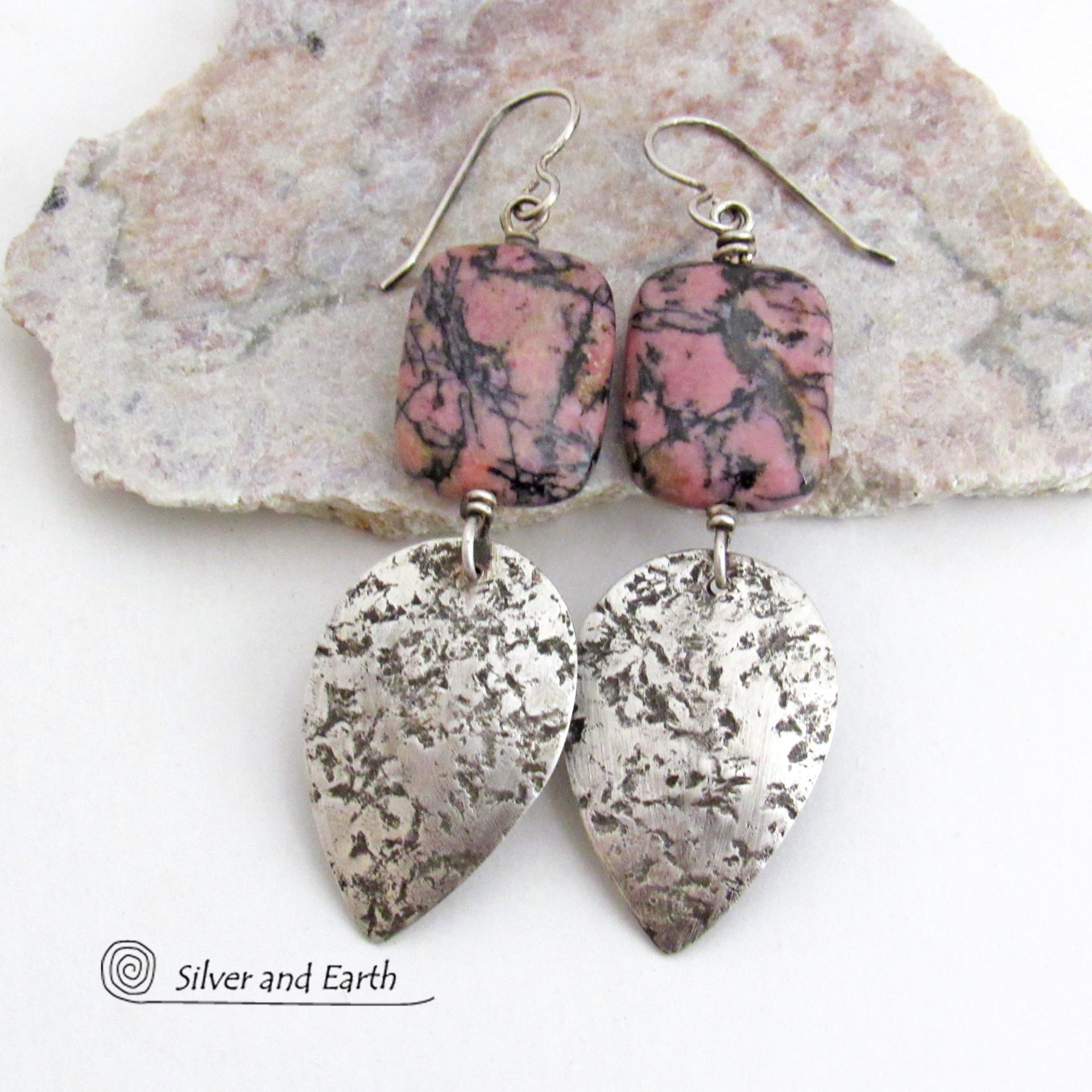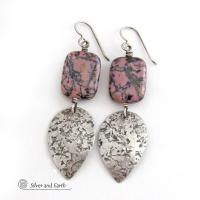 Natural rhodonite gemstones are accented with sterling silver dangles in these handcrafted earrings. The stones have a pink background with a dramatic natural matrix pattern of black streaks. They have a modern, earthy chic style and will make a great gift for a natural stone lover.