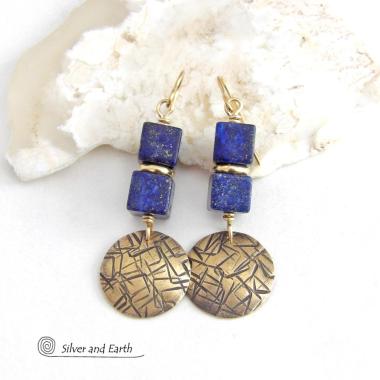 MEASUREMENTS: Total length of approx. 2-1/4" from top of brass ear wires and 3/4" at widest point. Created out of solid gold brass; the shapes were hand stamped for texture; oxidized and polished for a golden glow; then sealed with jeweler's wax to resist tarnishing. They are signed on the back with my initials.