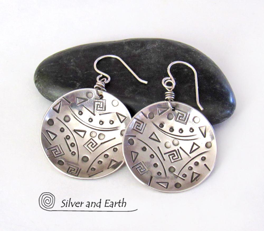 MEASUREMENTS: Total length of 2” from top of sterling silver ear wires and 1-1/4" at widest point. I created the shapes out of solid sterling silver sheet and created the texture by hand stamping the metal with several different design stamps. The shapes were domed upward for dimension; edges hand filed meticulously smooth; then oxidized, buffed and polished to enhance the detail. They are signed on the back with my initials and sterling stamp.