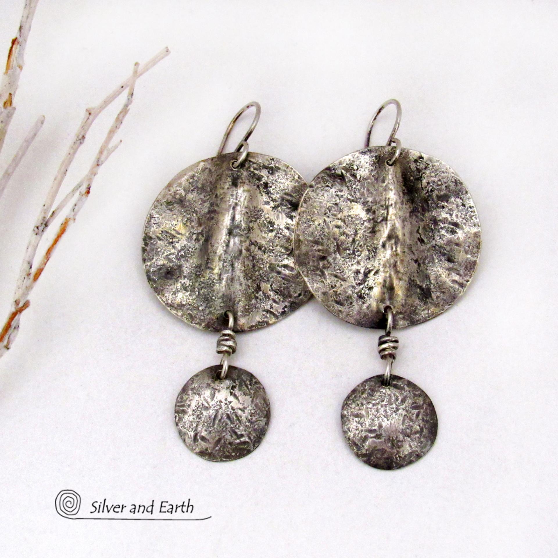 Modern and versatile - these handcrafted sterling silver dangle earrings have an earthy, organic design with an edgy, modern style. Perfect for everyday wear - they go with everything. They feature solid sterling silver with a rustic, hammered texture and an oxidized finish.