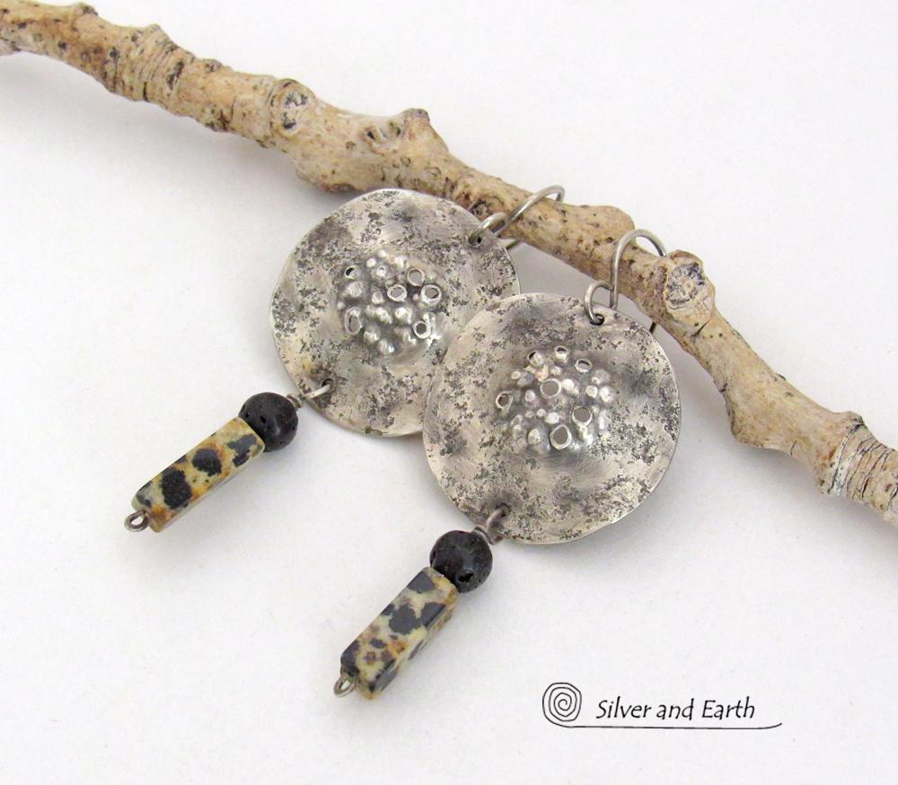 Rustic Hammered Sterling Silver Earrings with Dalmatian Jasper and Black Lava Stones