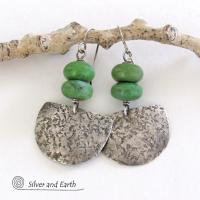 These handcrafted sterling silver earrings have a rustic, hammered texture accented with natural green serpentine stones with a rich, forest green hue and subtle brown inclusions. They have an earthy, modern vibe that coordinates well with all wardrobe styles.