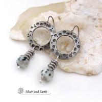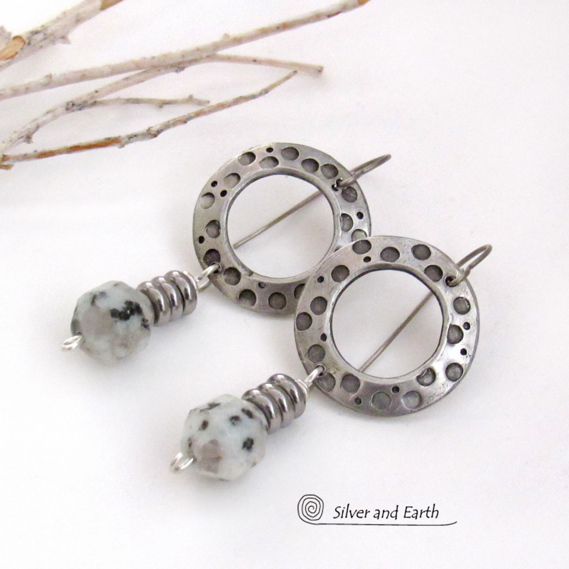 These handcrafted earrings feature oxidized silver pewter hoops with a rustic hand stamped texture accented with faceted natural kiwi jasper stones and stainless steel beads. This type of jasper is a combination of amazonite, tourmaline, and quartz that comes from New Zealand. The stones have a white crystal base with light gray undertones and spotted flecks of black. They have an earthy organic style with a modern, bohemian vibe and are lightweight and comfortable to wear.