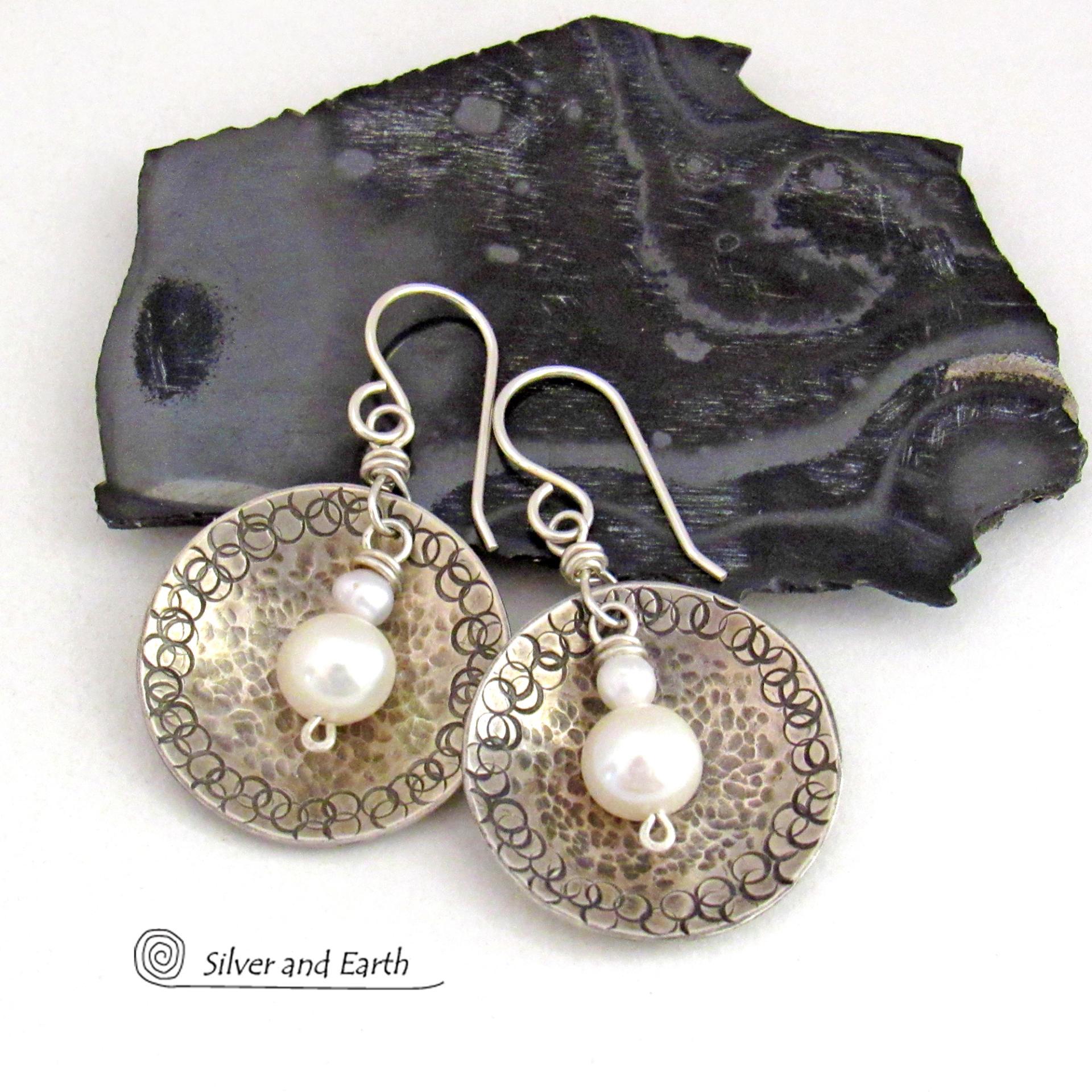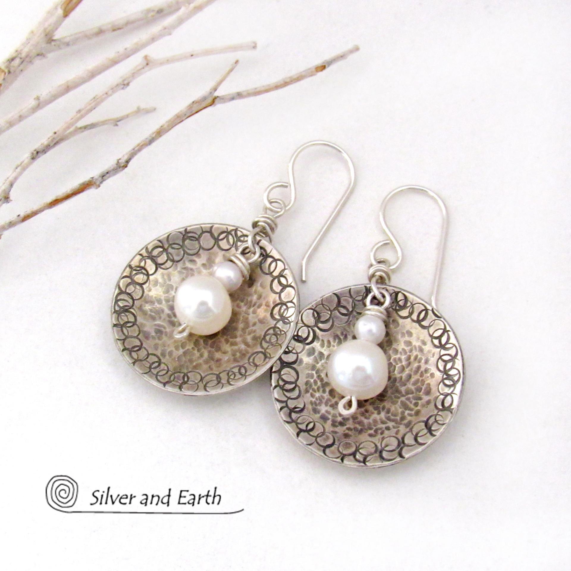 Perfect for everyday wear, these handmade sterling silver earrings are accented with dangling white pearls. The silver has a hand stamped and hammered texture and was oxidized to highlight the details. The pearls dangle in front and contrast beautifully against the silver metal. They have a classic modern and elegant feminine feel that looks great with all wardrobe styles. They'll make a great gift for someone born in June. Pearl is the traditional gemstone for this month.