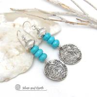 These handcrafted earrings feature textured sterling silver dangles accented with a stack of blue turquoise stones topped off with silver pewter beads. They have a modern chic style with a touch of southwestern flair and are perfect for anyone that loves the southwest style.