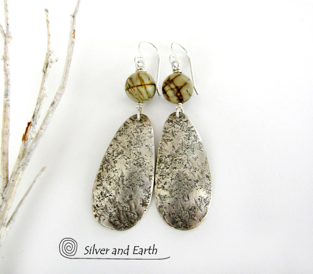 These sterling silver dangle earrings are accented with natural picasso jasper stones. The stones have a light mossy green and taupe background, along with a natural matrix of brown veining. I created the dangles out of solid sterling silver sheet; lightly hammered them to create an organic texture; then gave them a charcoal patina to enhance the detail. They have a modern earthy style and will coordinate well with all wardrobe types.